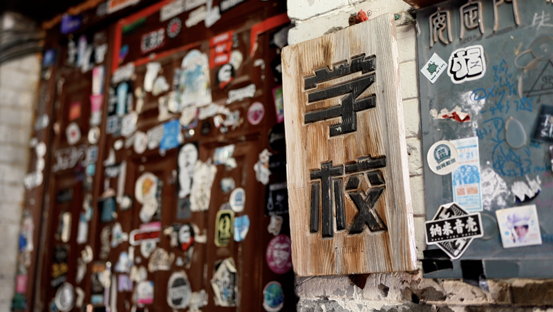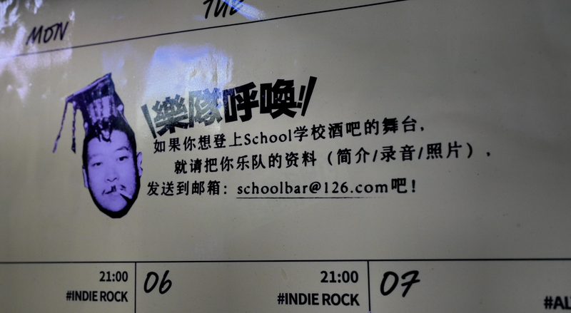 SCHOOL酒吧的门脸小到俩人并排进不去,一块比巴掌大点儿的木牌子上写着“学校”俩字,没霓虹灯,一走一过甚至容易错过,但在爱摇滚乐、爱乐队文化的人眼里,“这儿,太闪耀了”!