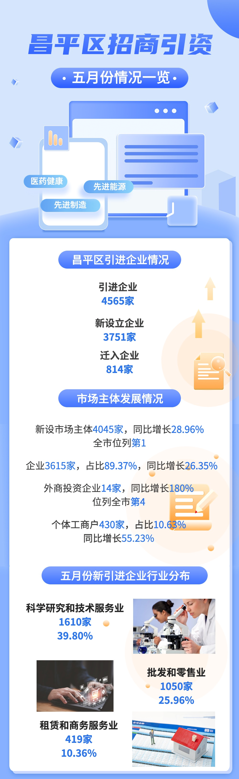 今年5月,昌平区共引进企业4565家,其中新设立企业3751家、京内迁入企业810家、京外迁入企业4家。5月份昌平区新设经营主体4045户,同比增长28.96%,位列全市第1;其中企业3615户,占比89.37%,同比增长26.35%;外商投资企业14户,同比增长180%,位列全市第4;个体工商户430户,占比10.63%,同比增长55.23%。