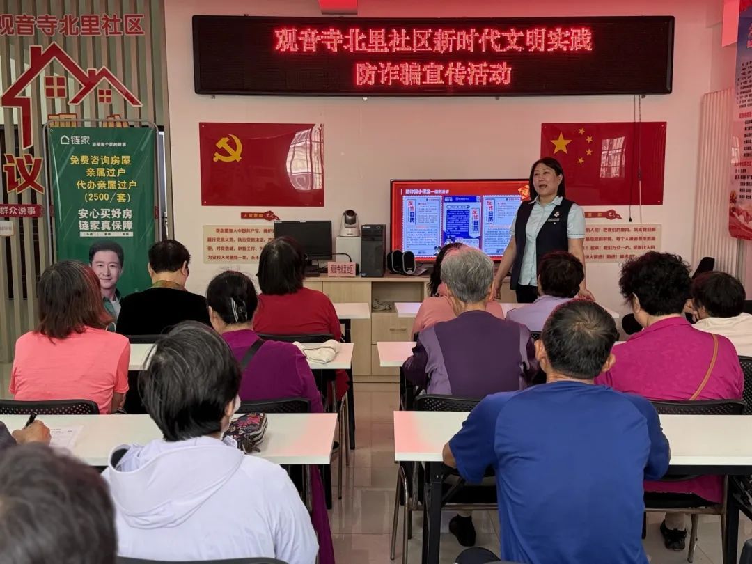 近日,观音寺北里社区新时代文明实践站联合中国邮政观音寺支行共同开展防诈骗宣传教育活动。活动现场,气氛热烈而有序,吸引众多居民前来参与。