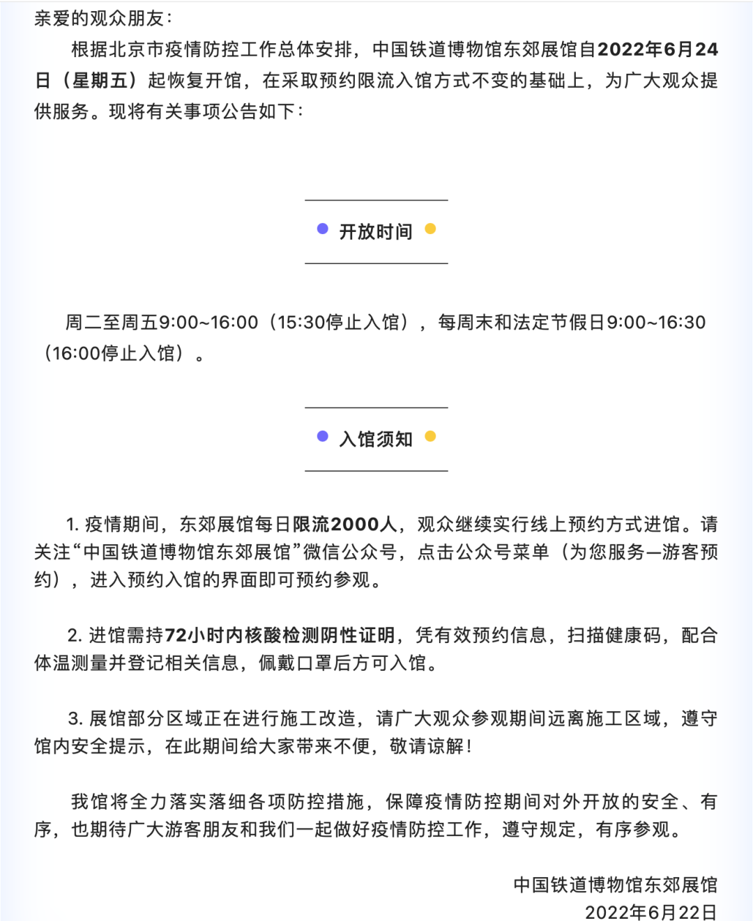 2、中国铁道博物馆东郊展馆恢复开馆公告