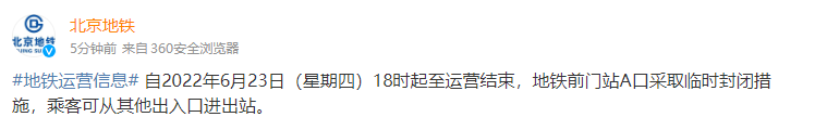 1、自2022年6月23日(星期四)18时起至运营结束,地铁前门站A口采取临时封闭措施,乘客可从其他出入口进出站。