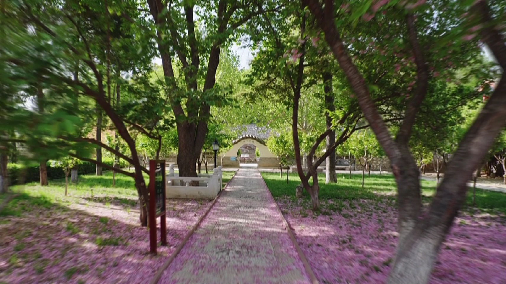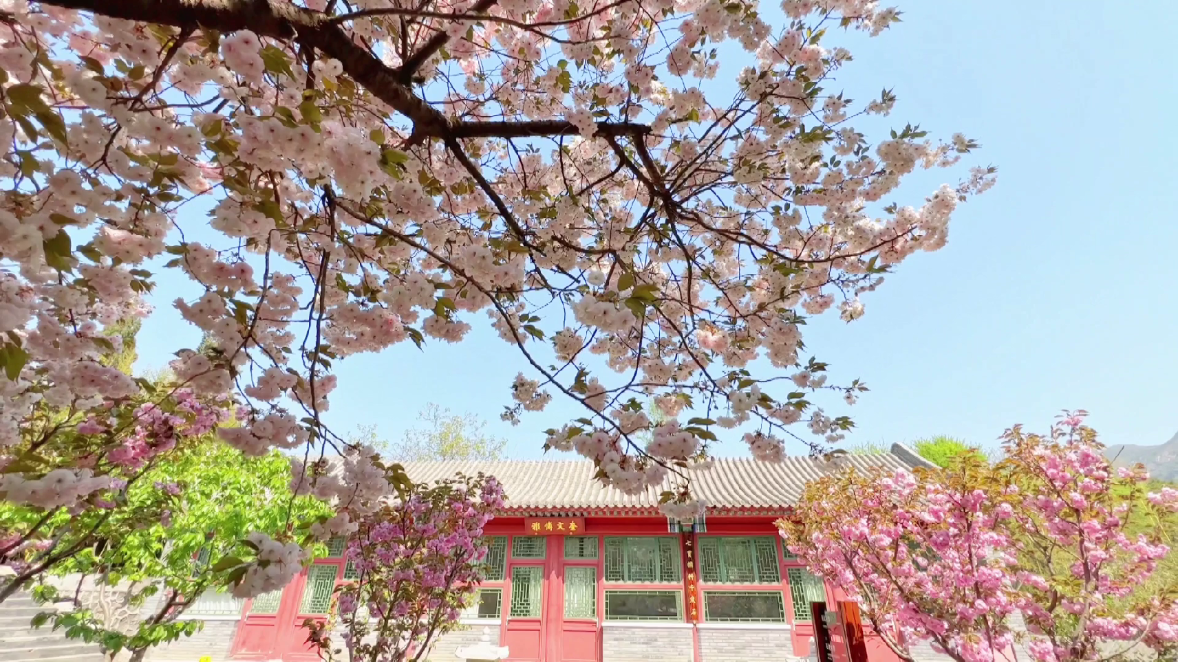 拾阶而上,西峪花宫内几十株樱花正相继盛开,花香四溢,古朴清丽的景观美的让人过目不忘。
