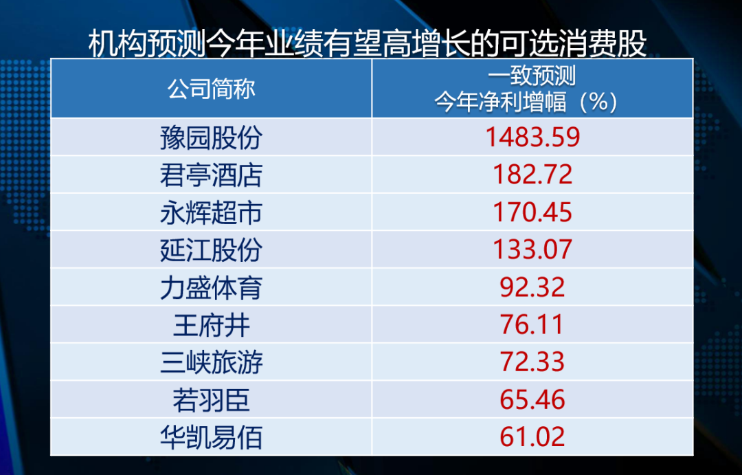 业绩方面,根据3家及以上机构一致预测,豫园股份2026年净利增幅居首,君亭酒店、永辉超市、延江股份3股业绩均有望实现翻倍增长,力盛体育、王府井、三峡旅游、祥源文旅等8股预计净利增幅均在50%至100%之间。