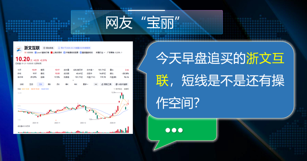 网友“宝丽”:今天早盘追买的浙文互联,短线是不是还有操作空间?