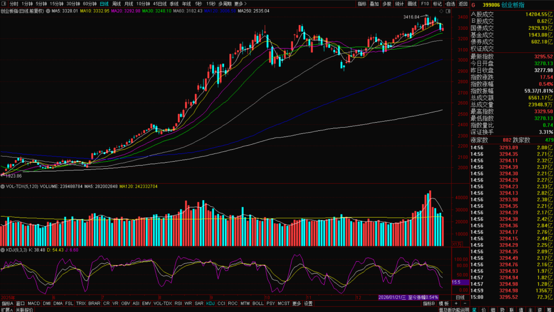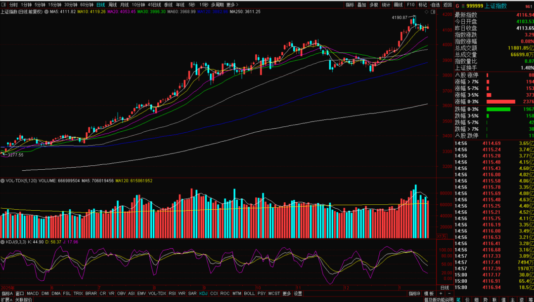 相应的1月14日大盘冲高4190点后一路向下,最多已经跌了110个点。