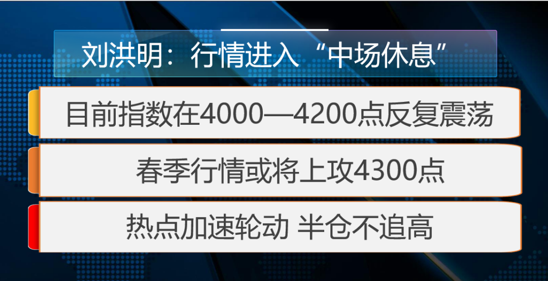 现场嘉宾刘洪明认为,目前行情进入“中场休息”: