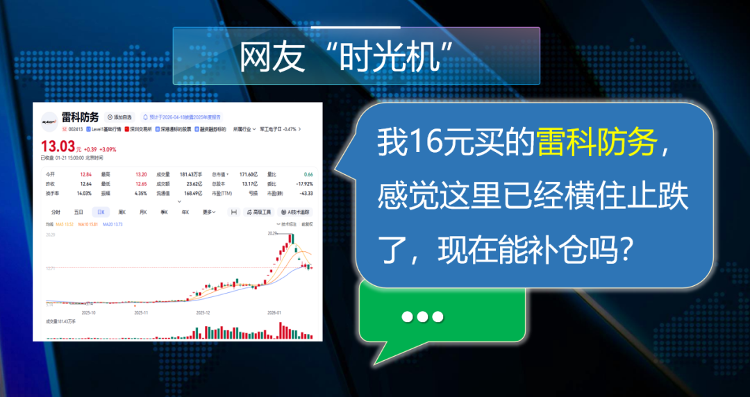 网友“时光机”:我16元买的雷科防务,感觉这里已经横住止跌了,现在能补仓吗?