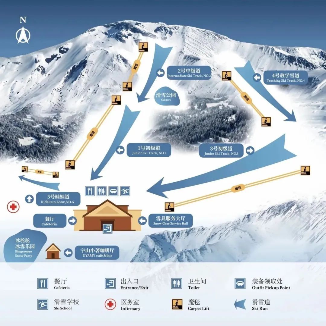 娱乐设施:雪具大厅重磅升级,增加了客用面积,增设智能化储藏柜及300套专业的滑雪用具;冰驼驼戏雪乐园设有雪地摩托、雪上挖掘机、雪圈等儿童戏雪项目,多元化丰富冬季度假生活