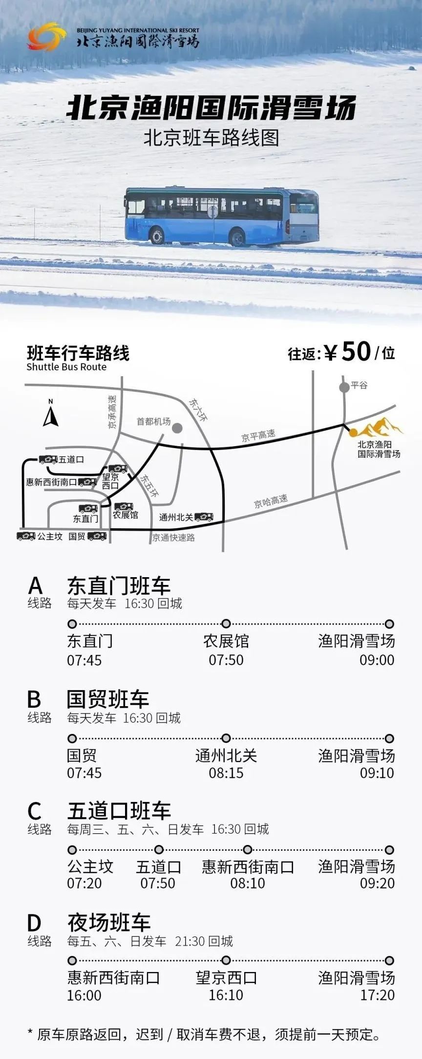 北京市区内设置多个雪场直通巴士站点,雪场内设置返程站点