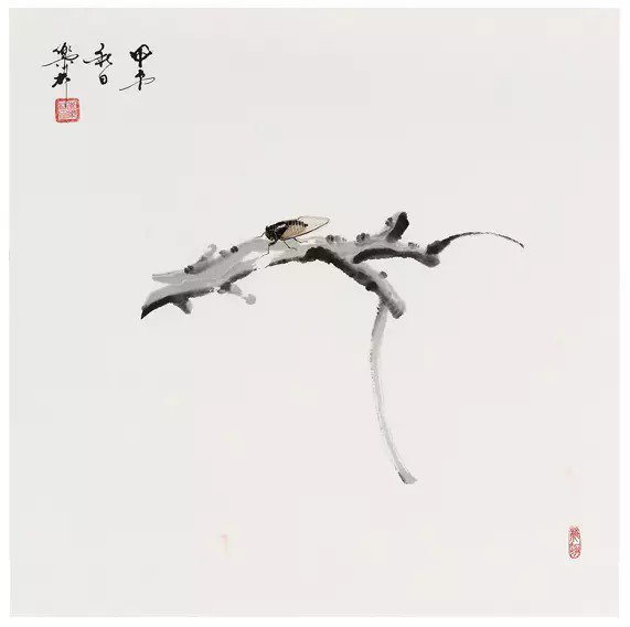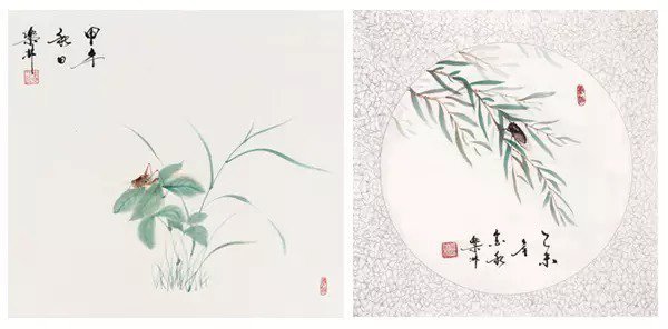 揽其工笔草虫,非常细致,有细到纤毫毕现的程度。草虫的触须细而长,真有一触即动的感觉。细笔中形神兼备,辅以小写意,一张一弛,画面富有节奏感。