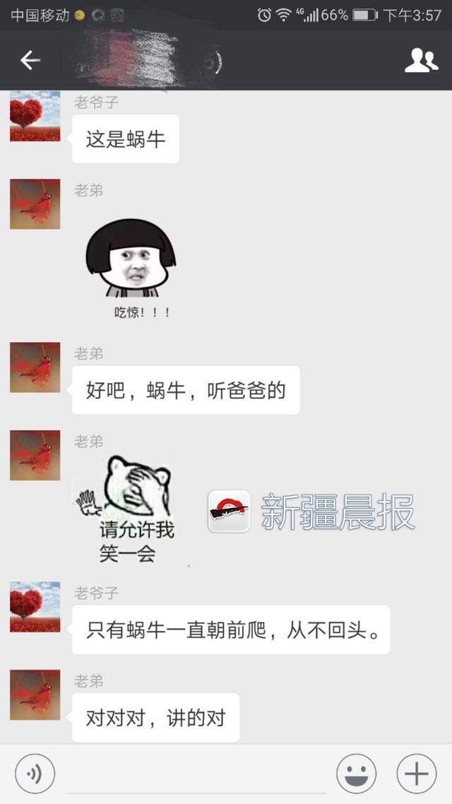 在马先生提供的聊天截图里,新疆晨报记者看到,马先生指出父亲的表情错了后,马先生的父亲仍坚持:“这个表情是蜗牛,只有蜗牛一直朝前爬,从不回头。”
