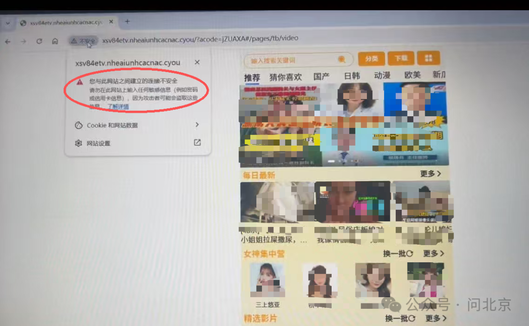 为核实这些涉黄小广告背后网站的潜在风险,“问北京”记者随机选取了广告上的一个涉黄网址,用手机实际访问测试并全程录制操作画面。