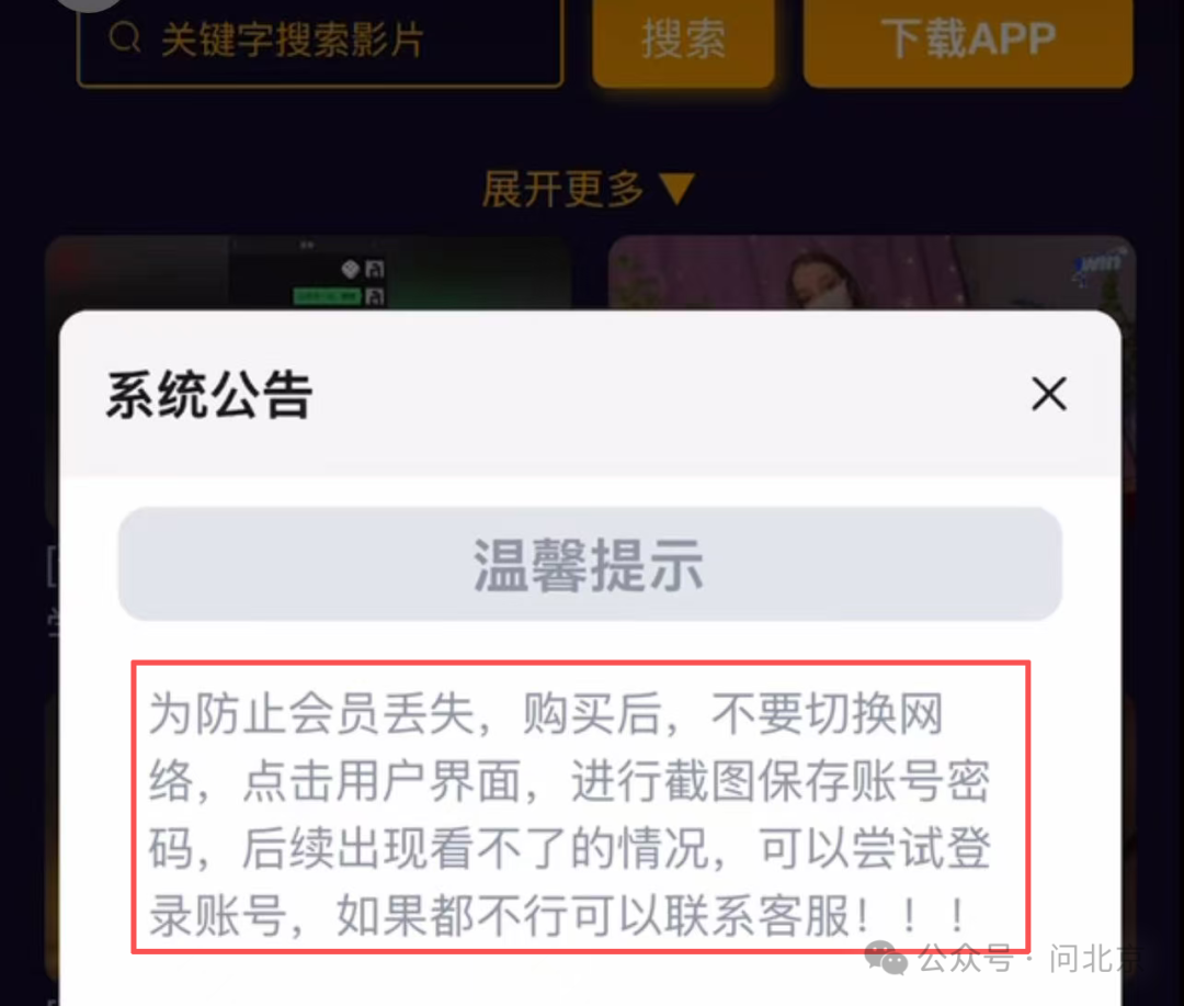 网站还在操作界面标注了会员使用的相关要求,明确提示购买会员后不要切换网络,需截图保存账号密码,此类运营模式与现行的各种正规网络平台相差甚远。随后,记者又通过电脑登录了若干小广告上的网址,发现部分链接已经失效,能登录的网址都被电脑内部的防火墙提示有安全风险。