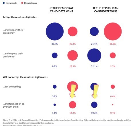 前有上一轮大选的前车之鉴,后有今年竞选期间的剑拔弩张,人们还担心,即便选举当天相安无事,但总统宝座能否和平交接。有独立组织调查报告显示,如果对方政党的总统候选人胜选,14%的共和党人和11%的民主党人表示会采取必要行动,推翻大选结果。