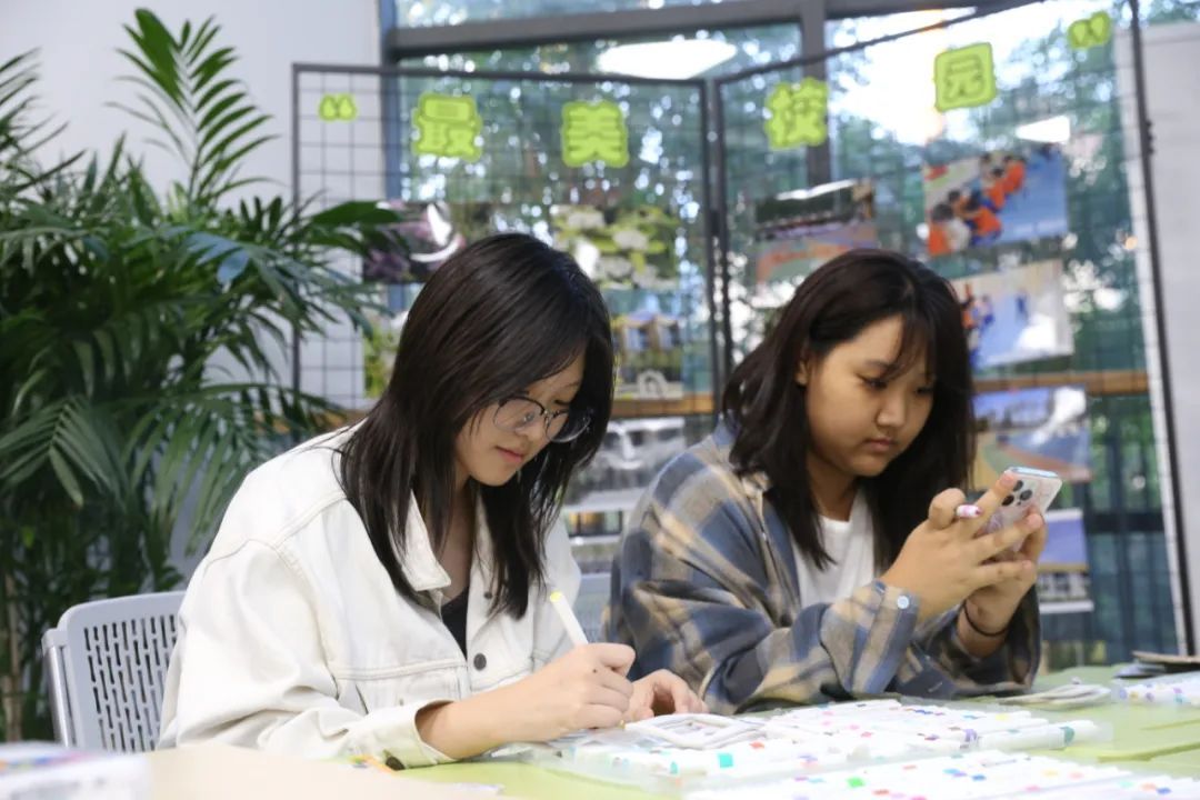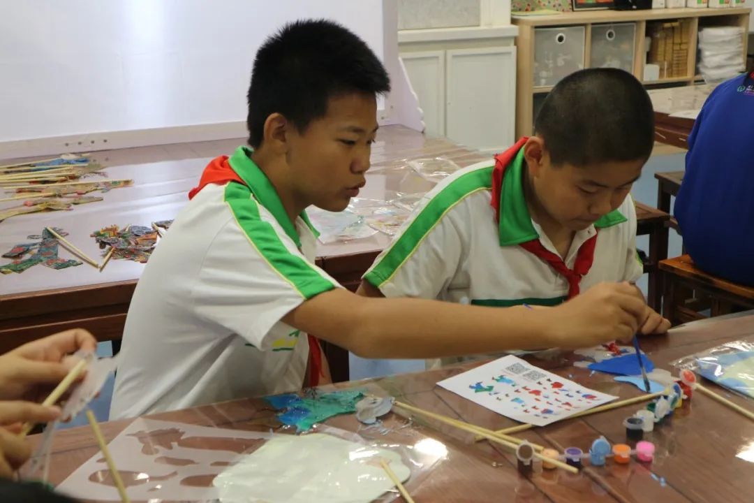 除了有趣的艺术活动,学校还设置了丰富的艺术摊位体验,同学们可以选择皮影人物敷彩制作、手提袋的设计上色、书法(扇子、书签、挂件)综合体验等进行打卡。