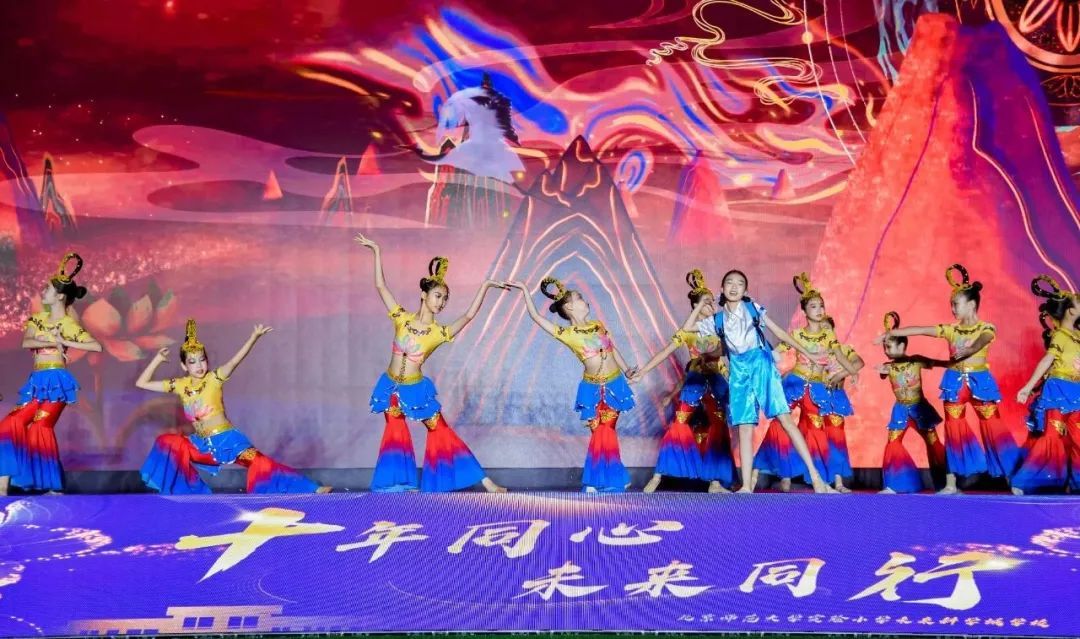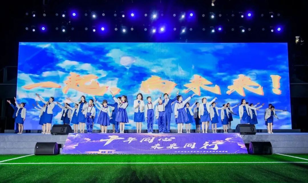 全校师生在璀璨夺目的灯光下欢庆,在明媚灵动的音符中载歌载舞,共同庆祝建校十周年,亦欲以此为契机,全面展示办学成果,这一曲桃李芬芳的诗歌礼赞,这一程风光旖旎的漫漫跋涉,将会赓续笃行。