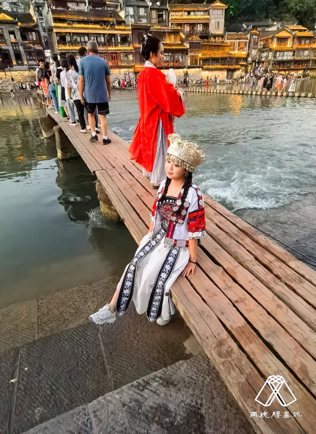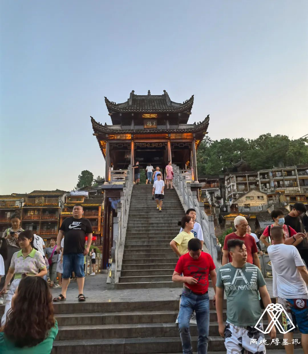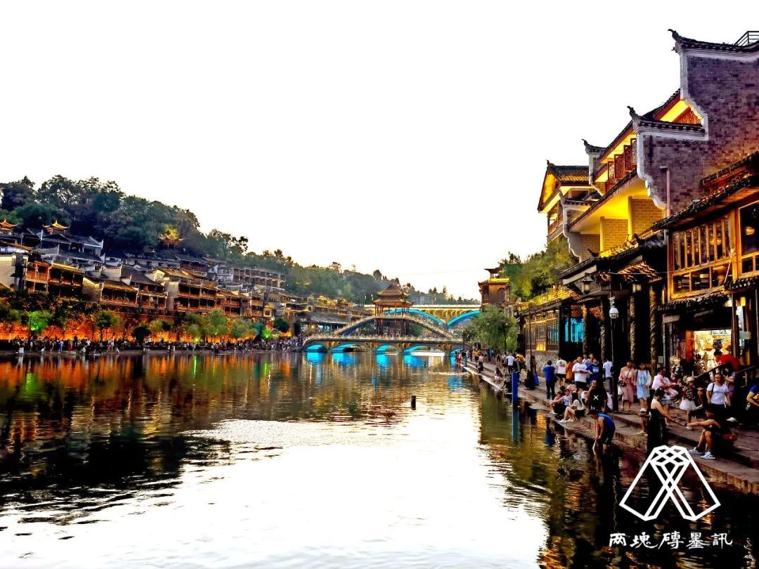 壬寅七月,陪莫言老师游凤凰古城。参观沈从文先生故居,浮生六记前留影。夜来灯光人影在沱江河流水中摇曳如画屏,使人流连忘返。填《望仙门•游凤凰》以记此行。