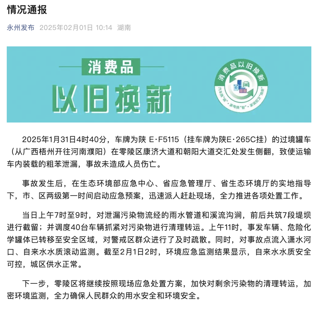 据“永州发布”微信公众号消息,2月1日,湖南省永州市零陵区应急管理局发布关于粗苯泄漏事故的情况通报。
