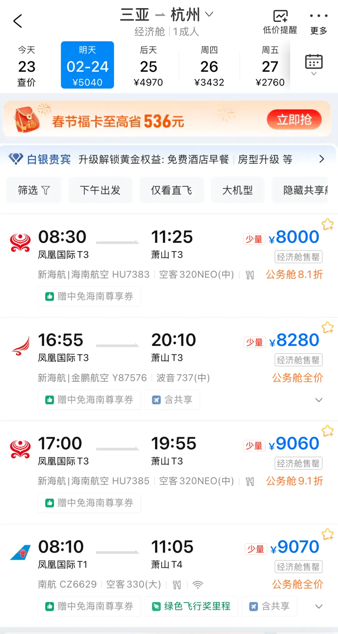 三亚至广州、深圳的航班在23日同步“售罄”,24日仅剩中转航班,售价超过7000元。2月24日,三亚至杭州的直达航班售价仍旧维持在8000元以上。