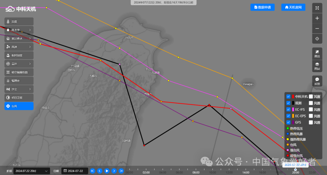 图说:7月22日,台风“格美”进入24小时警戒线前,中科天机预测出其首次登录地点位于台湾宜兰县南澳乡