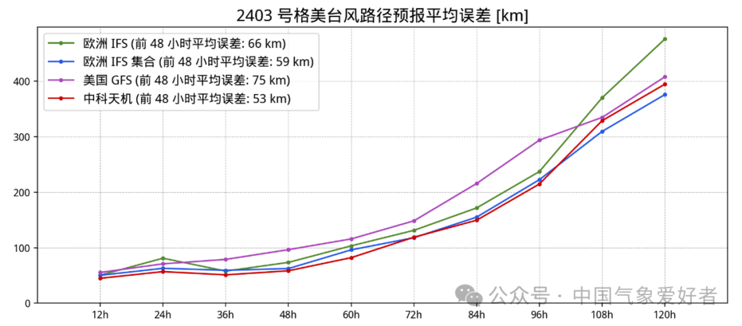 图说:台风“格美”路径预报的平均误差对比,中科天机优于欧美的模式
