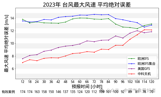 图说:2023年西太平洋所有台风的最大风速预报中,中科天机整体优于欧美的模式