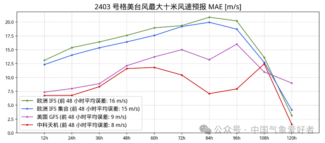 图说:台风“格美”风速预报的平均误差对比,中科天机优于欧美的模式