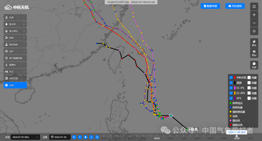 图说:7月20日,台风“格美”刚刚生成,中科天机预测的台风路径与真实路径的误差最小