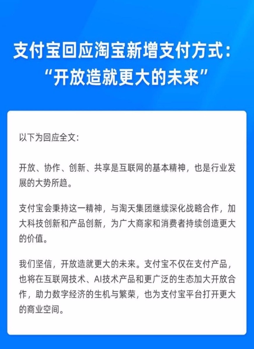 而作为目前淘宝主要的支付服务方,支付宝也于当日火速表态:开放造就更大的未来。支付宝对此回应时表示,开放、协作、创新、共享是互联网的基本精神,也是行业发展的大势所趋。