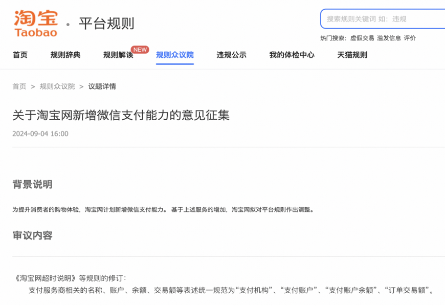 9月4日,淘宝天猫公告称,为提升消费者购物体验,淘宝计划新增微信支付能力,并于本意见征集结束后,进行平台规则调整。据悉,本次调整将覆盖全体淘宝和天猫商家。