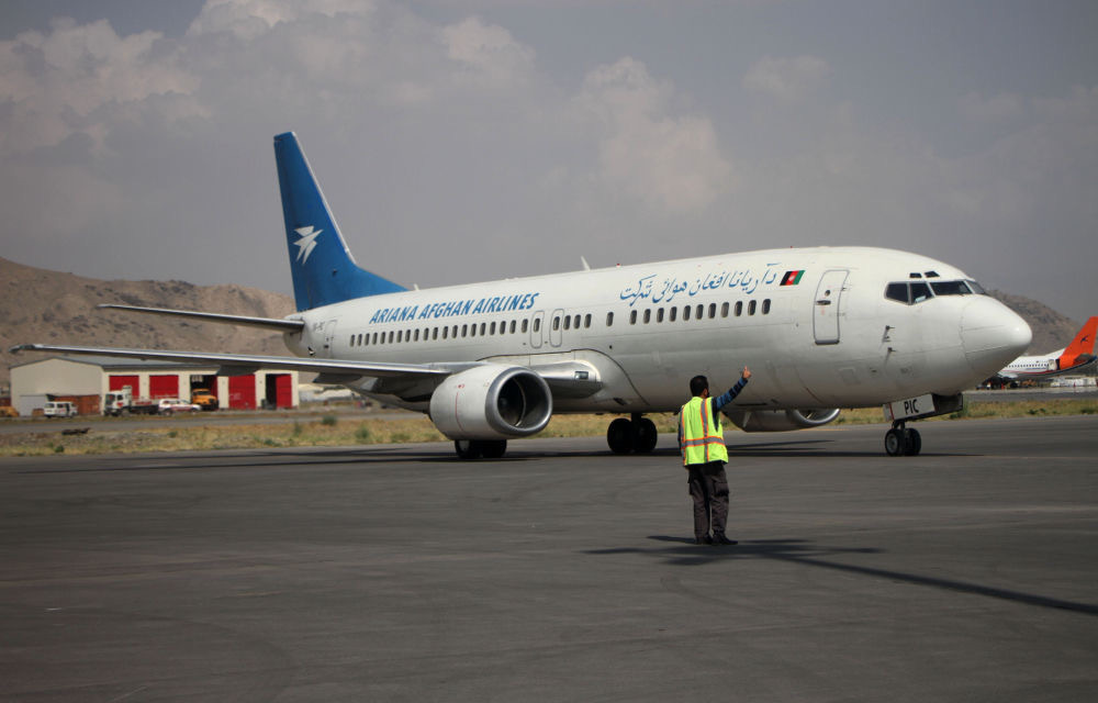 这是9月20日在阿富汗喀布尔国际机场拍摄的一架阿富汗阿里亚纳航空公司飞机。