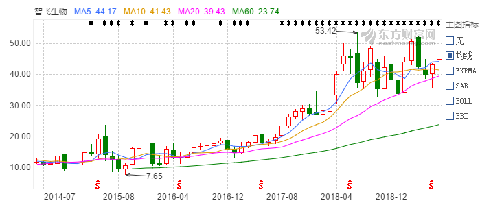 上市之初,智飞生物的营业收入和净利润一直表现平平,直到2017年、2018年业绩开始猛增。2017年、2018年,其营业收入为13.43亿元、52.28亿元,净利润分别4.32亿元、14.51亿元,2018年净利润较2017年增加10.19亿元,而2016年的净利润仅为3252.03万元。而伴随着业绩的走高,股价、市值也随之走高,截止发稿,公司股价44.76/每股,公司总市值高达716亿元。