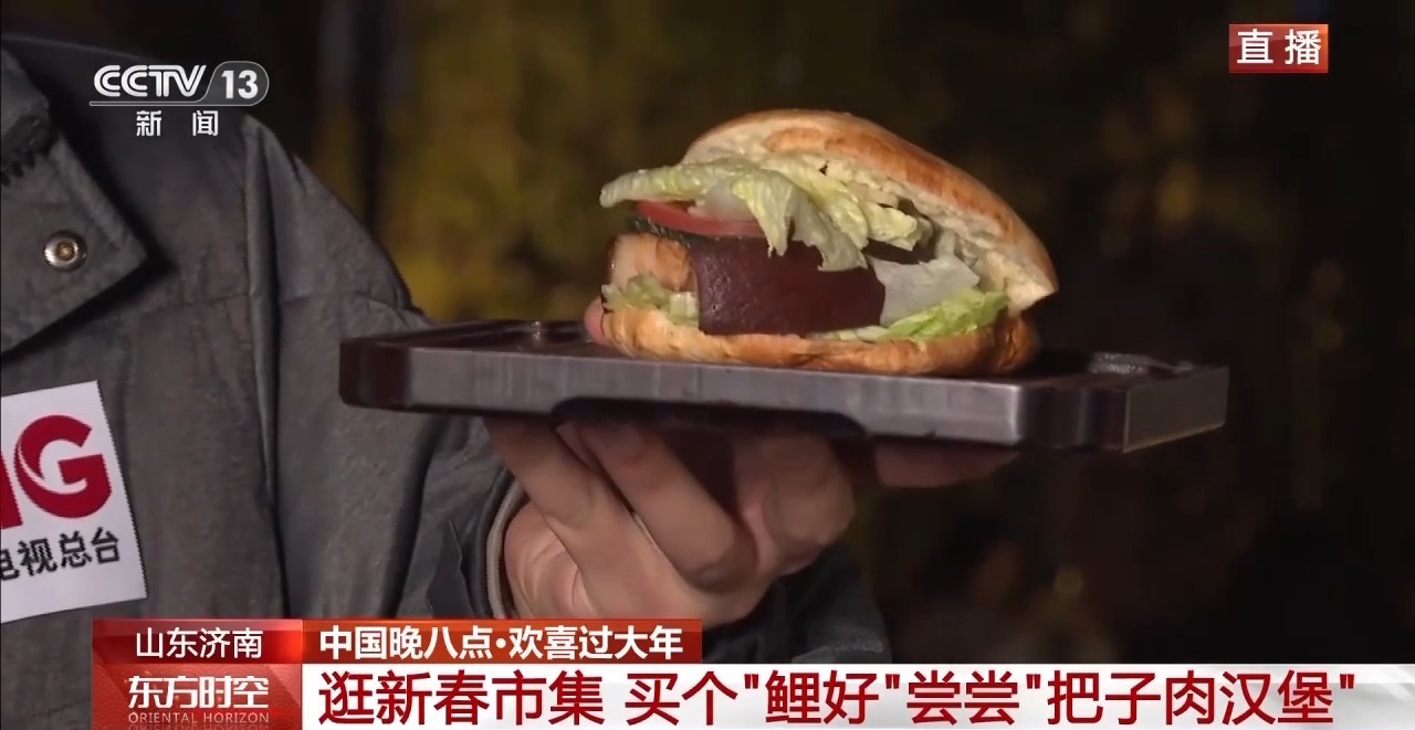 新春出游,也少不了美食相伴,在我身旁就是新春集市摊位了,传统小吃和创新口味齐聚一堂。比如这款“把子肉汉堡”,把济南传统把子肉夹进松软面包之中,肥瘦相间、酱香浓郁,一口咬下去,肉汁与面香交融,既保留老味道,也多了几分年轻化表达。