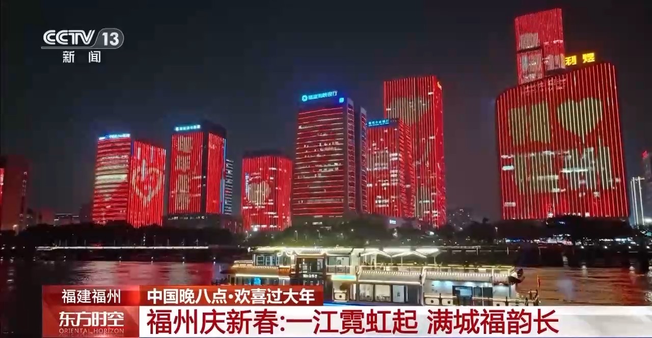 大年初一,整个福州城都在用最浪漫的方式与大家一起同庆春节。此时此刻,闽江两岸流光溢彩,独属于这个春节的绚烂光影,将30多栋楼宇点亮,宽阔的江面变成了一块流动的画布,铺满了缤纷色彩。闽江上的江心小岛,也变身七彩霓虹中的童话世界,激光投影和3D技术在建筑立面上,展开了一幅跨越时空的精美画卷。