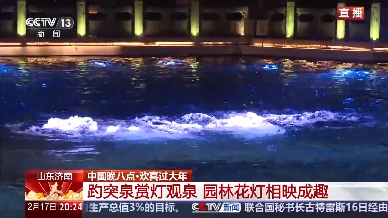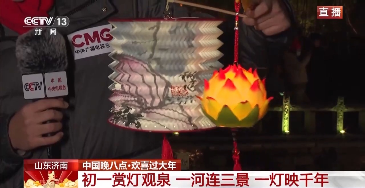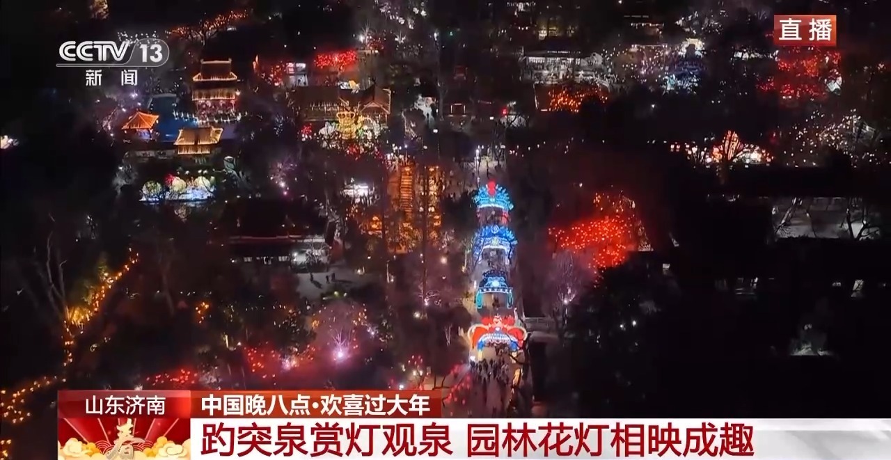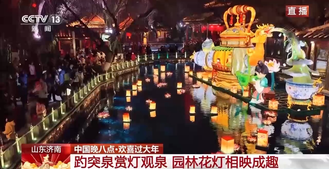 记者 曹俊懿:欢迎大家来到大年初一的山东济南。我现在就在趵突泉公园。此时此刻花灯璀璨、游人如织,整座园子被节日的灯火点亮。