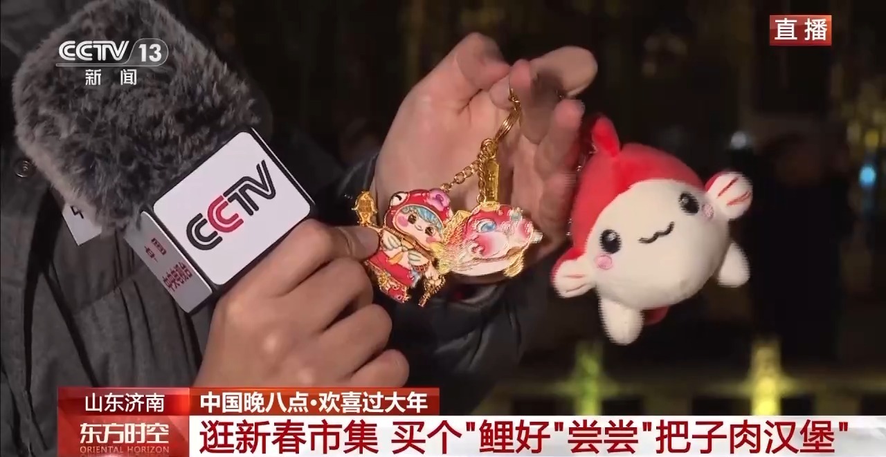 济南天下第一泉景区还推出了多样文创产品。我来给大家介绍其中很受欢迎的一位朋友,就在我的手上,它叫“鲤好”,是锦鲤的“鲤”字,有钥匙扣、冰箱贴、毛绒玩具多种形态。它以趵突泉泉水中的锦鲤为原型设计而成,寓意吉祥如意,可以让人们在新年把泉水里的好运带回家。