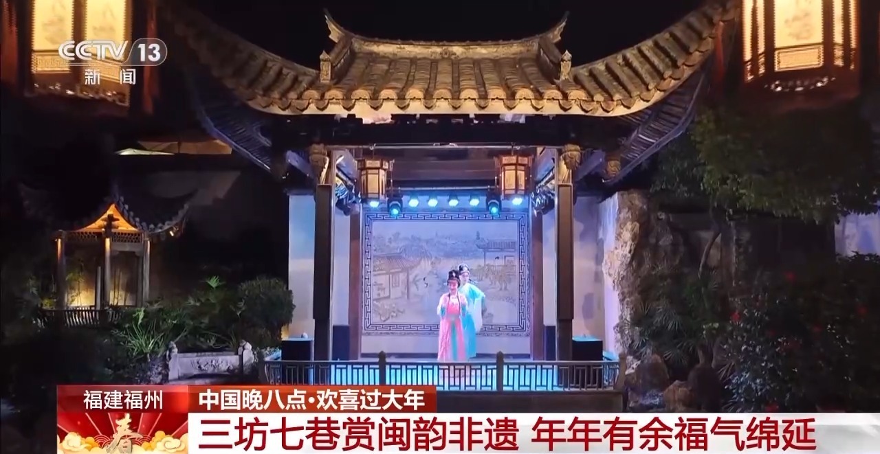 来到古色古香的水榭戏台上,正在表演的是福州的传统闽剧,它是以福州方言来演唱、念白的地方剧种,通过戏曲身段、唱腔与手势,来传递“福、禄、寿、喜”的美好祝愿。