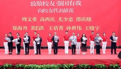 大会为“校龄荣誉奖章”“荣休纪念奖章”获得者代表颁奖,向校友代表献花。全校师生、海内外校友和社会各界人士通过线上直播方式“云端”相聚。(供图:对外经贸大学)