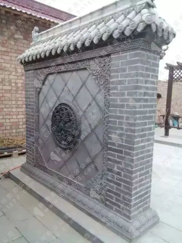 简单一点的影壁可能没有什么装饰,但也必须磨砖对缝非常整齐,豪华的影壁通常装饰有很多吉祥的图样。影壁墙上的砖雕主要有中心区域和四角。中心方砖上面雕刻有中心花、岔角,在影壁墙的中央还镶嵌有福寿字的砖匾或者是带有吉祥意味的砖雕。