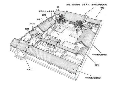 北京正规四合院一般依东西向的胡同而坐北朝南,基本形制是分居四面的北房(正房)、南房(倒座房)和东、西厢房,四周再围以高墙形成四合,开一个门。