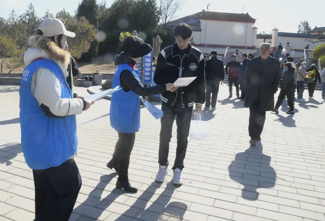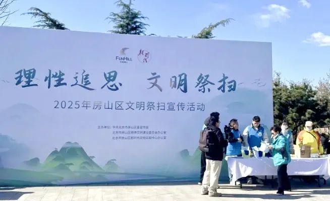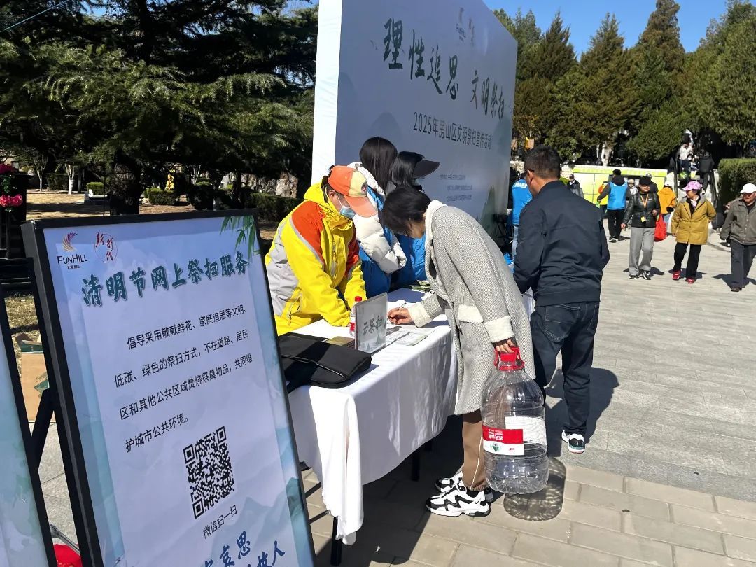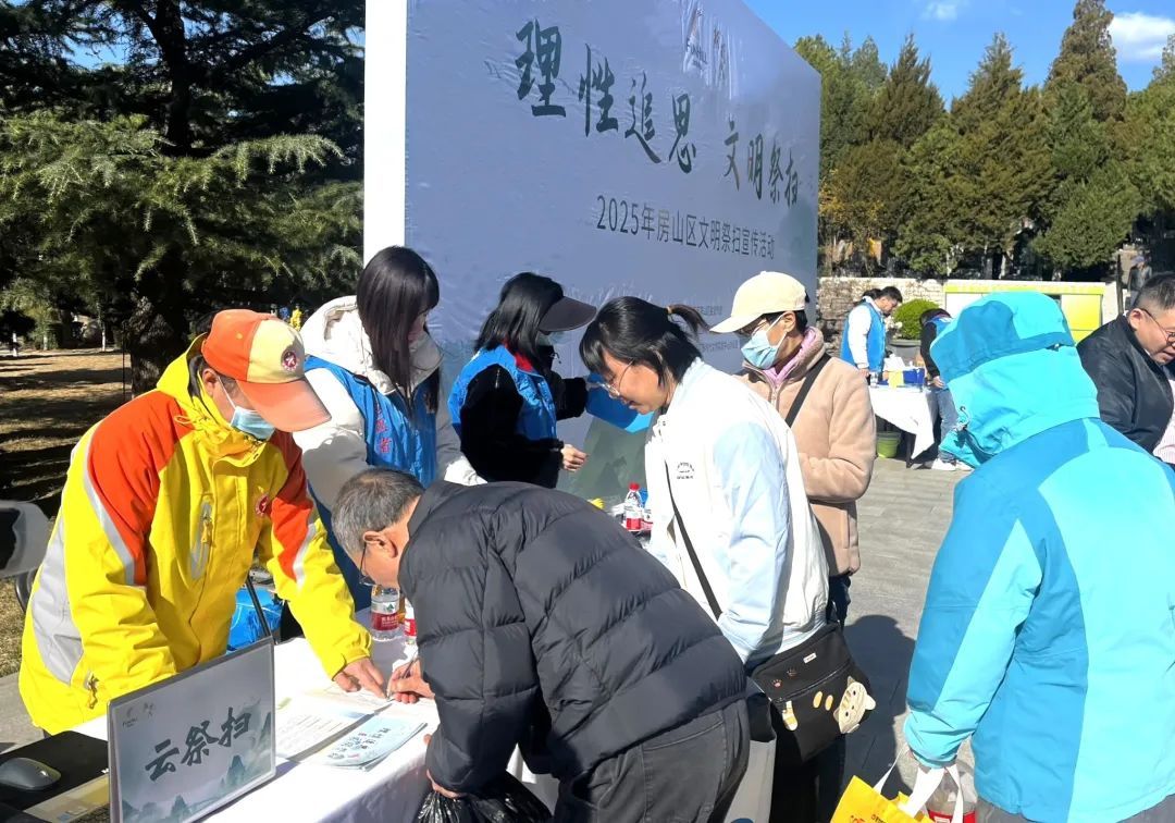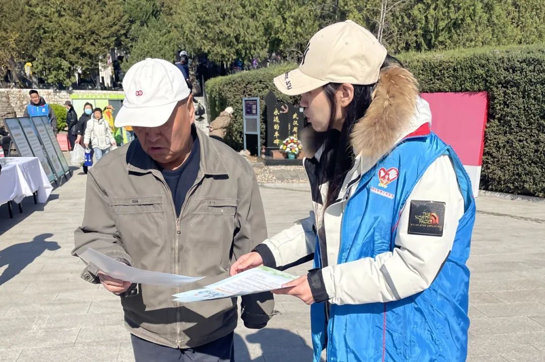 活动现场设置了主宣传展台。志愿者热情地向每一位前来祭扫的市民发放“理性追思 文明祭扫”倡议书,耐心地为大家讲解绿色祭扫、文明祭扫的意义与方式,引导大家自觉摒弃焚香烧纸、燃放鞭炮等不文明习俗。为了扩大宣传,还在现场发放《房山区市民文明手册》和环保购物袋,让更多的市民参与进来,做践行文明祭扫理念、弘扬时代新风的传播者。