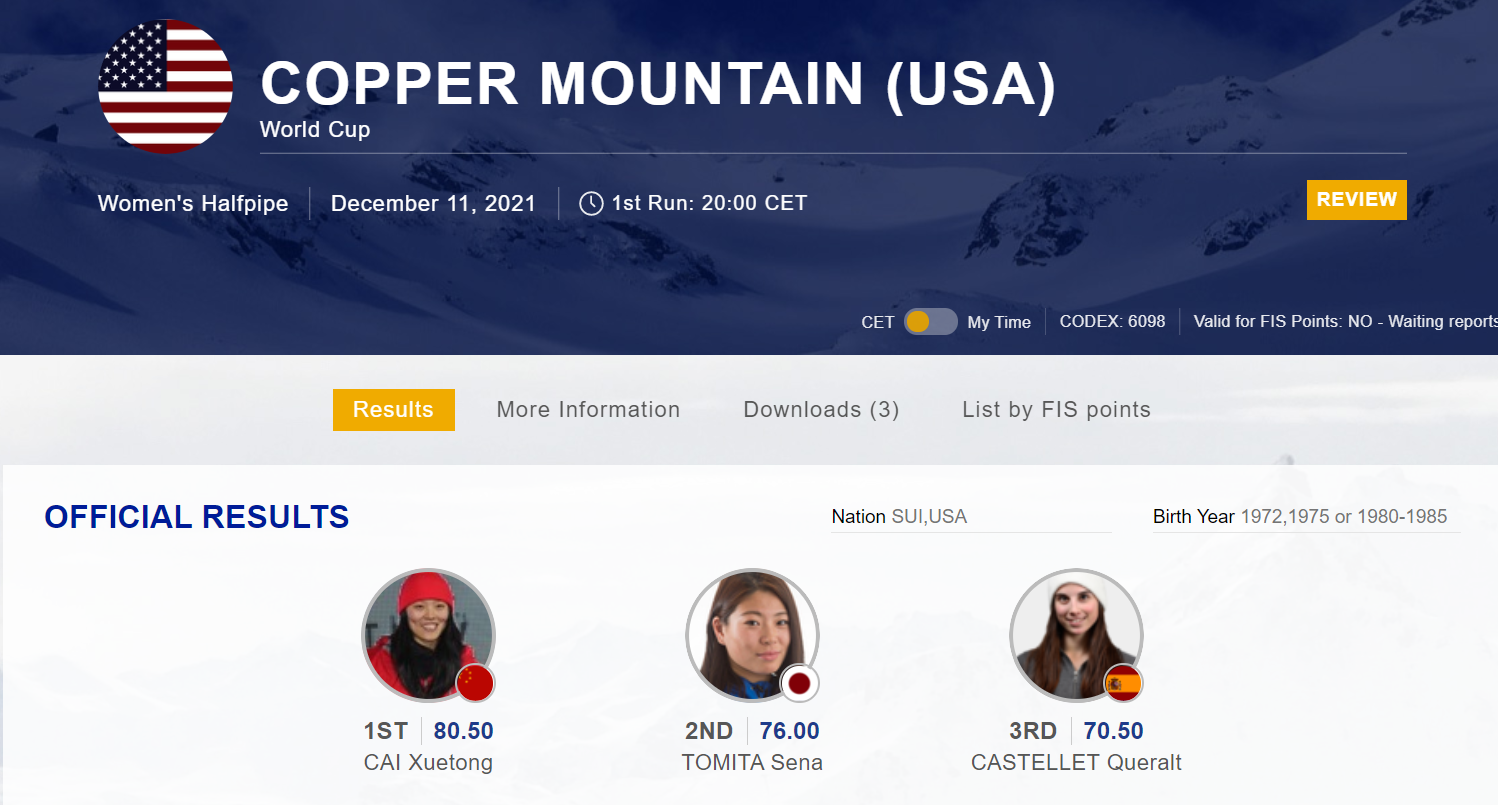 北京时间12月12日凌晨,2021/2022国际雪联单板滑雪U型场地世界杯美国铜山站比赛落下帷幕,现世界排名第二的中国名将蔡雪桐在女子组决赛中以80.50分的成绩摘得桂冠。而就在此前,12月11日深夜,2021/2022国际雪联自由式滑雪空中技巧世界杯芬兰鲁卡站比赛落下帷幕,由徐梦桃、孙佳旭和齐广璞组成的中国空中技巧队勇夺混合团体金牌。