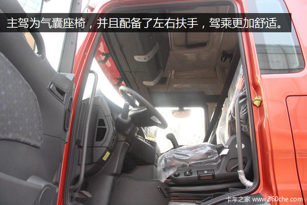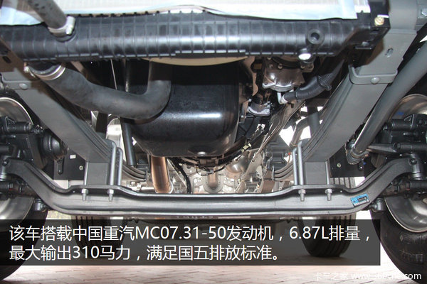 重汽310马力发动机:该车搭载中国重汽MC07.31-50发动机,6.87L排量,最大输出310马力,当转速在1200-1800转时,输出最大扭矩1230N.m。采用SCR后处理技术,满足国五排放标准。
