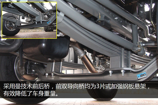 双导向桥少片簧:采用曼技术前后桥,前双导向桥均为3片式加强钢板悬架,有效降低了车身重量。