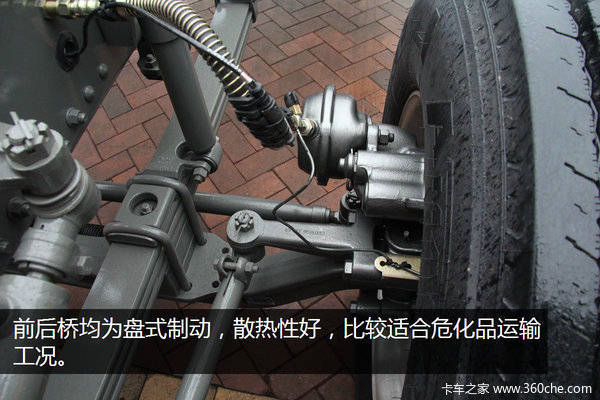 全车盘式制动:前后桥均为盘式制动,散热性好,比较适合危化品运输工况。