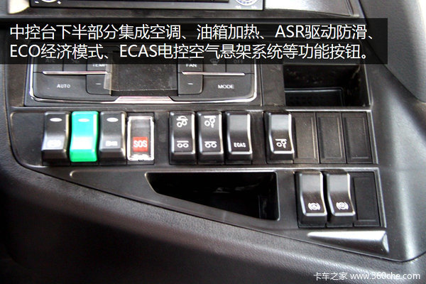 中控台下半部分集成空调、油箱加热、ASR驱动防滑、ECO经济模式、ECAS电控空气悬架系统、应急停车警示灯、等功能按钮。另外,用户可根据需求选装EBL(电子制动力分配)、TPM(轮胎压力监控),整车更安全可靠。