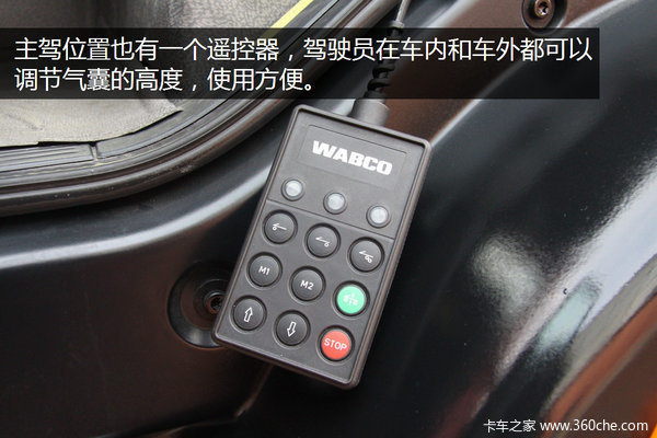 气囊高度调节:汕德卡C5H 8气囊采用ECAS电控空气悬架系统,在主驾位置有一个遥控器,驾驶员在车内和车外都可以调节气囊的高度。
