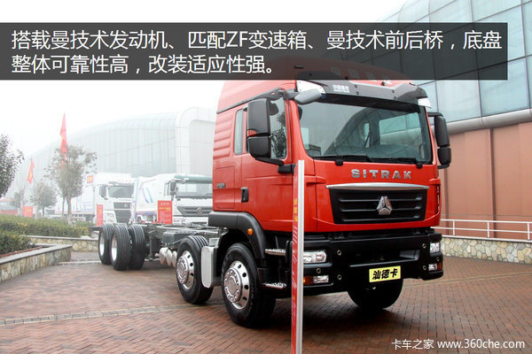 这款8X2车型采用曼技术发动机、匹配ZF变速箱、曼技术前后桥,底盘整体可靠性高,改装适应性强,是各种高端危险品、厢式专用车改装的不错选择。