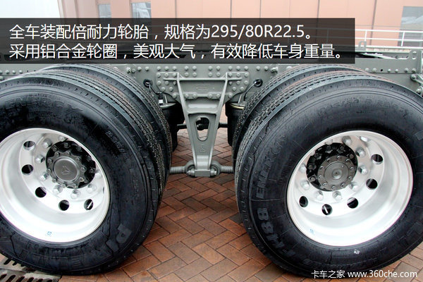 铝合金轮圈:全车装配倍耐力轮胎,规格为295/80R22.5。采用铝合金轮圈,美观大气,有效降低车身重量。