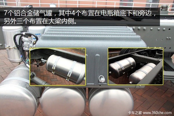 7个铝合金储气罐:该车配备7个铝合金储气罐,其中4个布置在电瓶箱底下和旁边,另外三个布置在大梁内侧。铝合金材质应用,符合轻量化设计趋势。